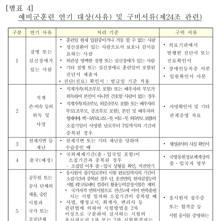 [별표 4] 예비군훈련 연기 대상(사유) 및 구비서류(제24조 관련)(예비군 교육훈련 훈령).pdf