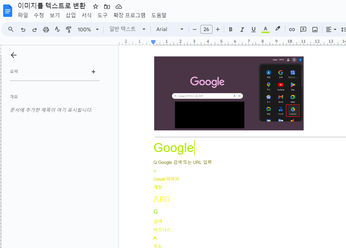 열린 Google 문서를 통해 이미지에서 텍스트로 인식된 부분을 확인할 수 있습니다.