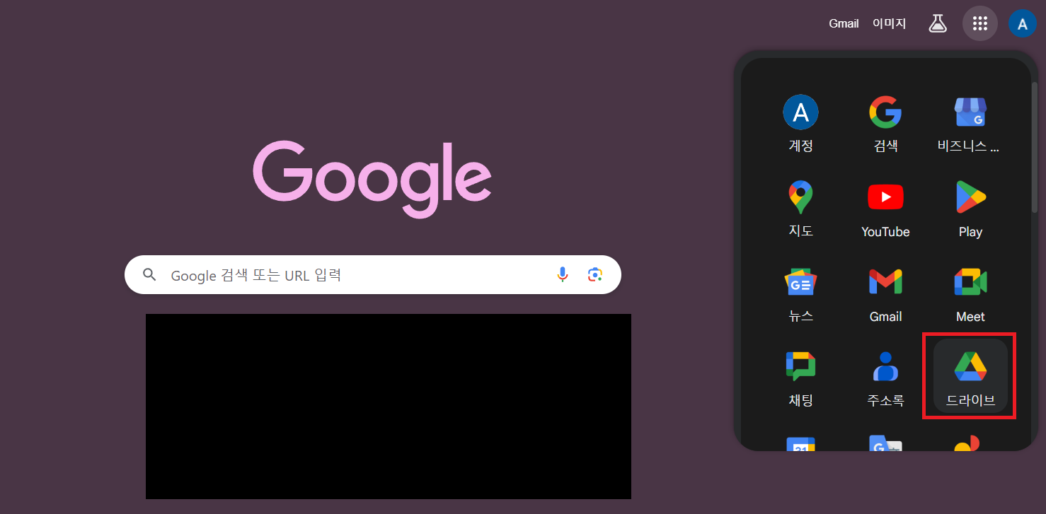 구글 드라이브는 아래 이미지에서 우측상단에 "점9개 정사각형"을 누르면 "드라이브" 클릭하면 들어갈 수 있습니다.