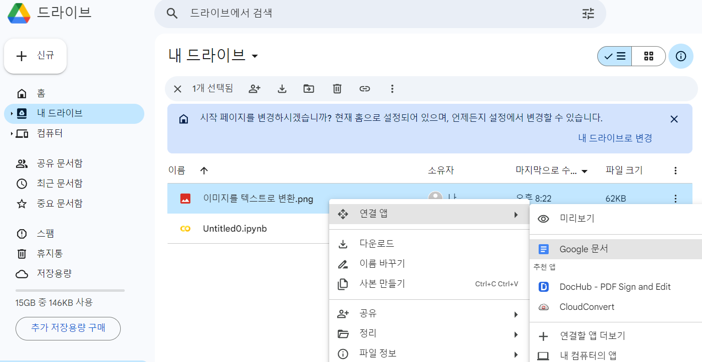 텍스트 변환을 원하는 이미지를 우클릭 -> "연결 앱" -> "Google 문서"를 클릭합니다.