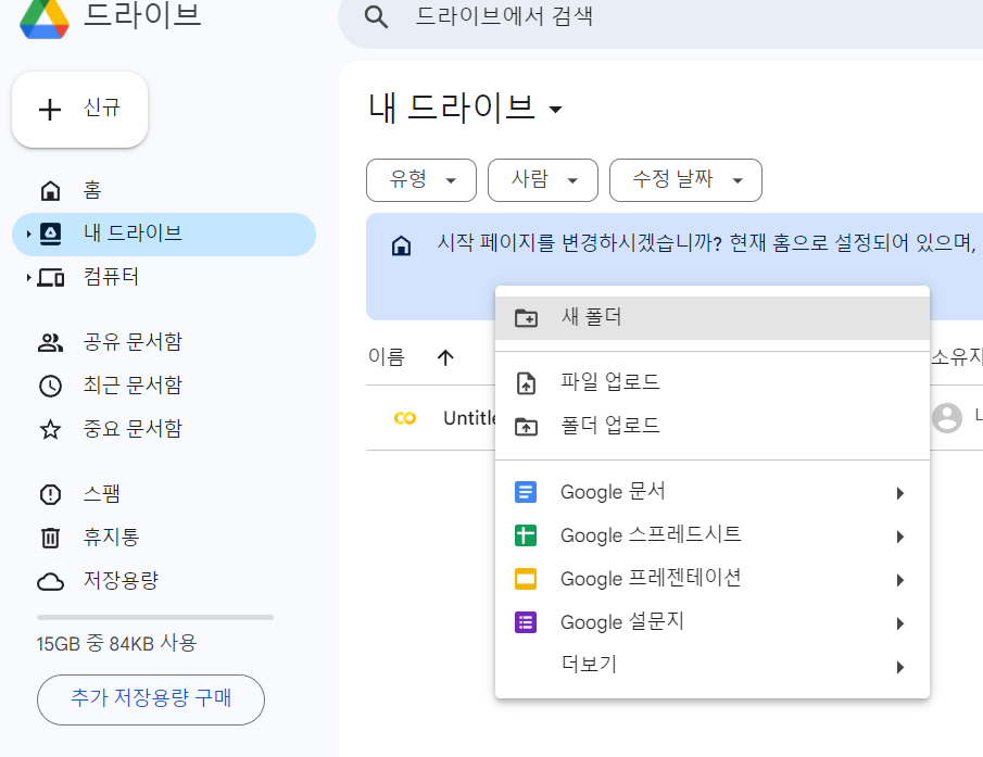 좌측 메뉴(카테고리)에서 "내 드라이브"를 클릭하여 이동합니다.